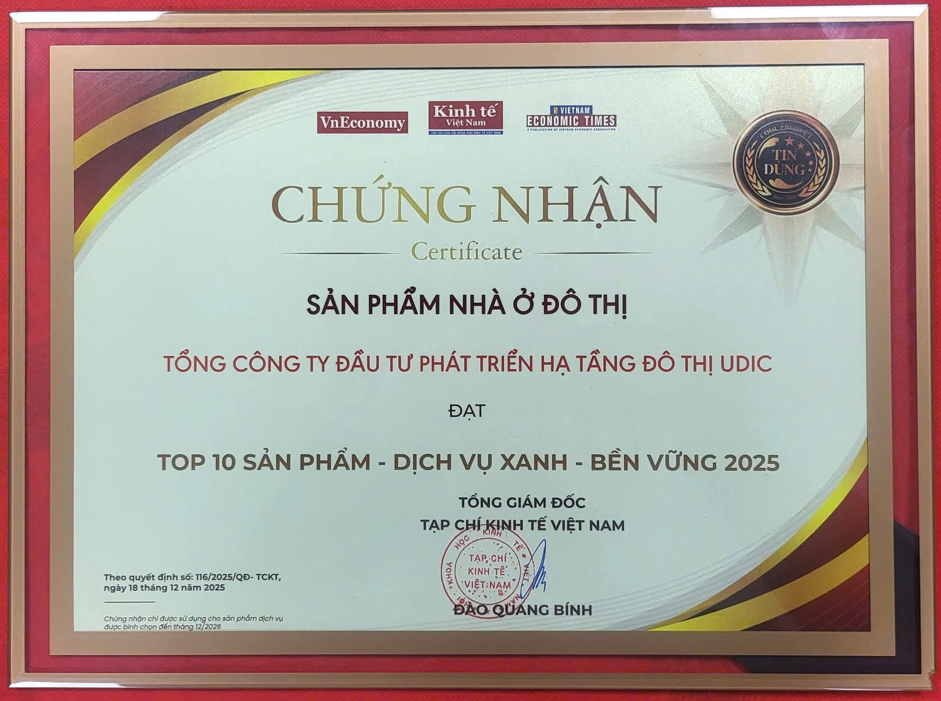 Ngày 18/12/2025 tại Hà Nội, Lễ công bố & vinh danh Sản phẩm - Dịch vụ Tin Dùng Việt Nam 2025 do Tạp chí Kinh tế Việt Nam - VnEconomy đã được tổ chức, Tổng công ty Đầu tư phát triển hạ tầng đô thị UDIC - Công ty TNHH Một thành viên được người tiêu dùng bình chọn và được vinh danh TOP 10 Sản phẩm - Dịch vụ xanh - Bền vững 2025.